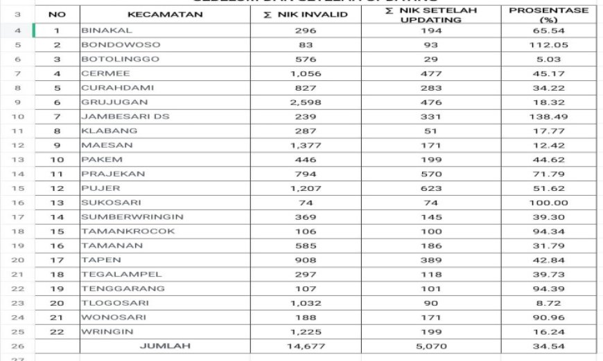 "se-Bondowoso data Invalid itu berjumlah 14,677 orang petani kasus seperti itu yang bermasalah dengan seputar administrasi kependudukan," imbuhnya.